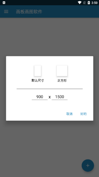 1、打开软件,在首页中点击“+”进行新建画布,在新建时可以选择画布的大小尺寸;