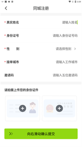 2. 点击同城注册或类似入口,输入您的真实姓名、身份证号和接单城市等信息完成注册。
