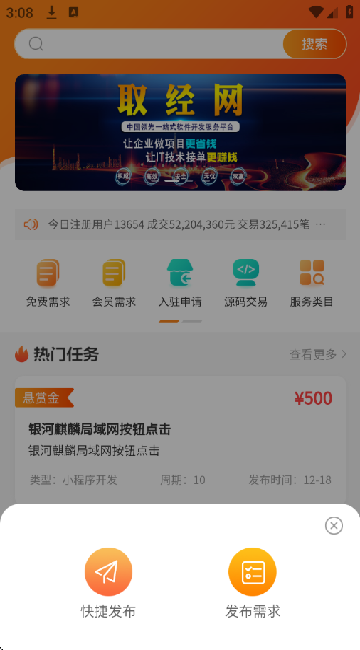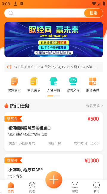 取经网是一个软件服务交易平台,具备软件开发、APP定制开发以及小程序开发等需求的人可以在这里找到海量服务商,服务商列表可以掌握在手中,在线可以与服务商直接沟通,私人定制服务可以在此体验,个性化的软件、小程序以及网站、游戏等开发定制服务可以在此找到,每个人所需要的软件服务可以在此找到,从分类之中可以找到全部软件服务,专业的开发设计人员时刻在线接单,用户可以得到极速的服务响应。同时,这款软件服务app支持在线接单,进入这里的任务大厅即可找到软件开发、网站设计以及小程序开发等任务,具备软件开发等技能的人可以在线接任务,不需要出门即可接任务赚钱,马上下载体验吧。