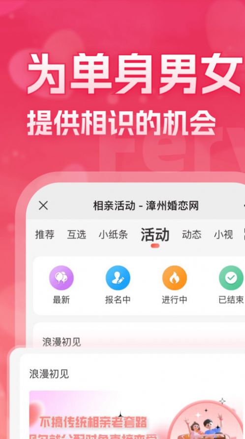 漳州婚恋网app是为用户提供的本地约会,交友服务的社交软件,大家可以在约会专栏参与更多感兴趣的线下约会活动,更好的认识各种的达人,能提供精准的筛选的服务,让你找到符合你共度余生的另一半,可以参与情感的测试,可以学习恋爱的知识,可以分享生活的动态,也可以在该广场里面搭讪自己感兴趣的人的综合软件。