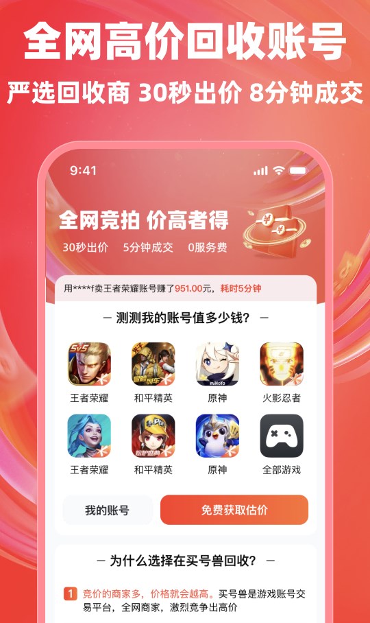 买号兽app是超好用的游戏账号交易平台,这里可以随时遇到游戏高手,游戏想要升级更快的话都可以直接买账号,价格比较的公开透明,平台也可以随时领取各种游戏账号福利哦。