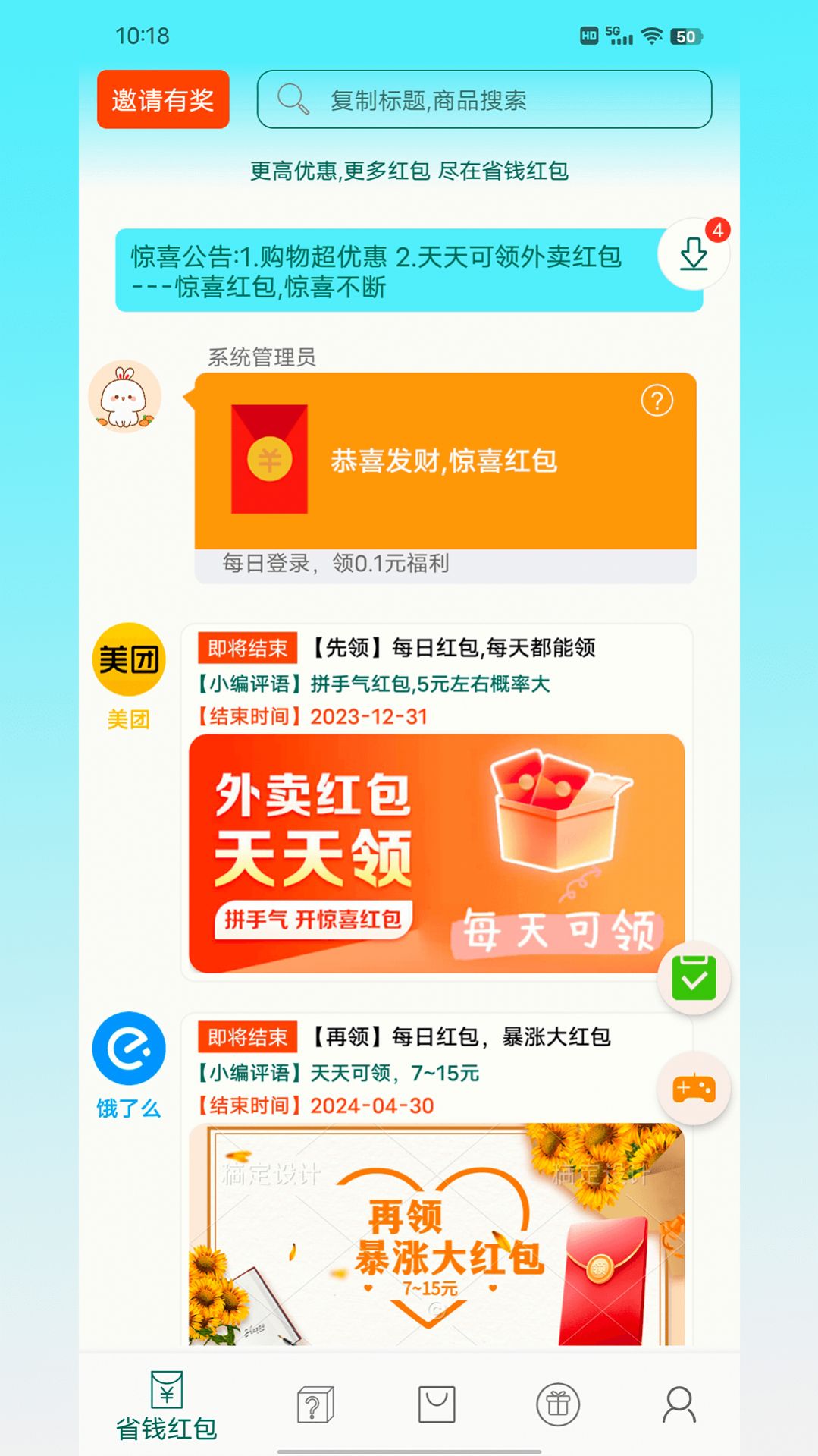 省钱红包app是可以随时省钱购物的电商软件,每天在线就可以领取现金的红包,可以获得购物返现的优惠的综合平台,随时可以在线抽奖, 可以买促销的商品,可以获得外卖平台的大额优惠券,可以享受生活的场景化的服务,能给到大家全面的服务体验,是采购商品更容易的一个综合软件。