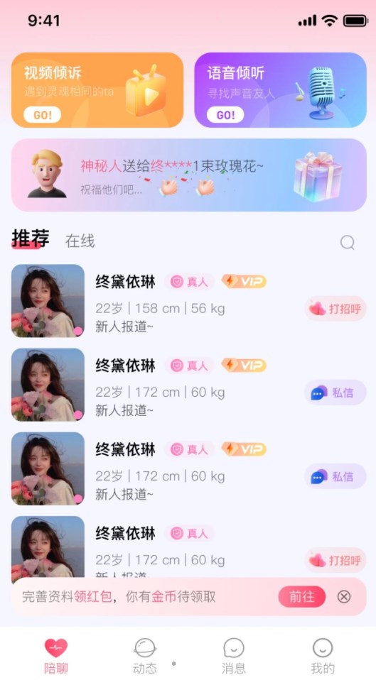 陌生人聊天找知己相守app是陌生人可以在线视频聊天交友软件,让你可以遇到灵魂合拍的人的综合社交神器,结交朋友更轻松,交互性超级的好,可以随时有不错的娱乐的体验,匹配合适的另一半的综合软件,可以在个人主页展示自我,完善自己的资料,全面的社交互动的综合软件,大家是可以随时去活跃的社交互动。