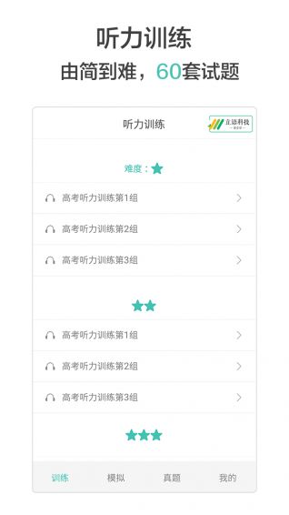 (1)听力训练。当前提供了近80套训练试题,从高一阶段到高三阶段,由简到难,循序渐进,逐步提升听力水平。更多训练试题,也正在制作当中。(2)听力模拟。30套高考模拟试题,试题类型、试题难度等,都与高考相近。