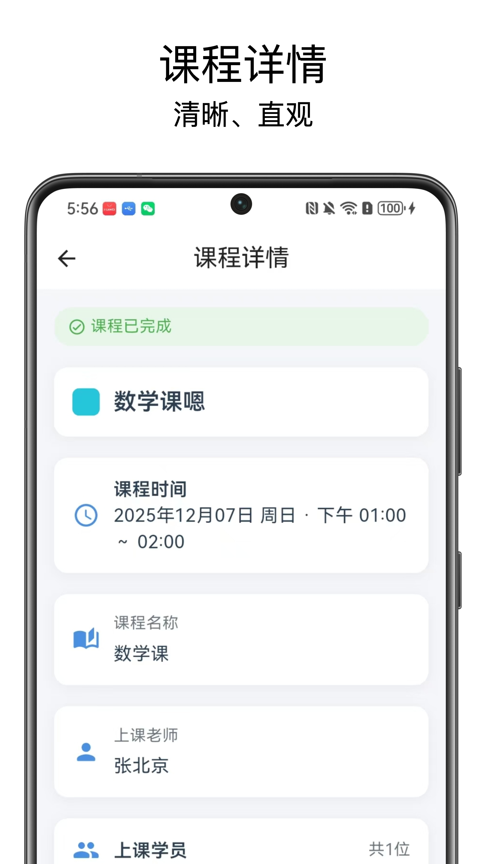 2、以日历形式直观展示每日、每周课程安排,上课时间、学员、老师等信息一目了然。