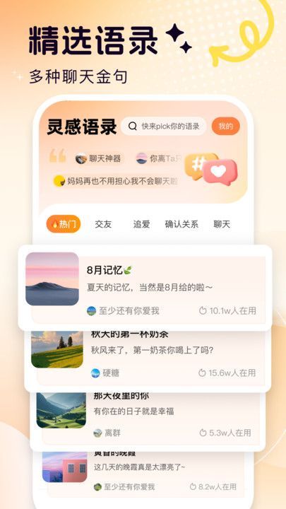 超会聊app是可以随时脱单的应用程序,这里认识的对象非常丰富,喜欢玩什么都可以,特别的给力,五湖四海的小伙伴们也多,这里24小时可以和玩家更好的交流,遇到热情的朋友们也可以开阔自己的交友圈子,这里智能化的配对交友模式,大家都可以更快的脱单。