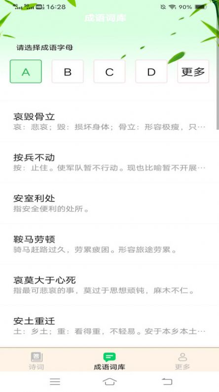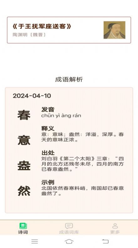 谷雨成语app专为爱好古诗词、成语典故者而设计的学习软件,旨在助其提升语言修养、文学素养,这里的诗词成语海量收录,涵盖古今诗词名句、经典成语、典故故事等,供用户学习参考,可以养成阅读,学习的习惯,随时鉴赏诗词,能以游戏的玩法加深知识的储备能力的综合软件。