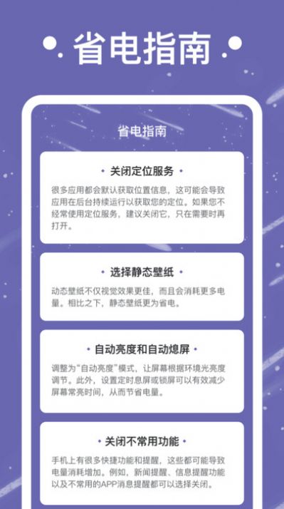 流星充电app是一款相当好用的手机充电管理软件,可以提供全方位电池管理与充电服务,大家可以养成好的习惯,可以设定充电铃音,随时充满提醒,还可以定期的优化自己的手机系统,清除缓存垃圾。