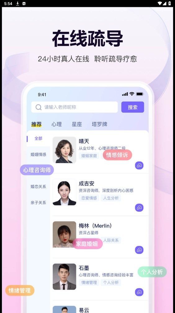 3、提供经过认证的专业心理咨询师,根据自己的需求选择合适咨询师。