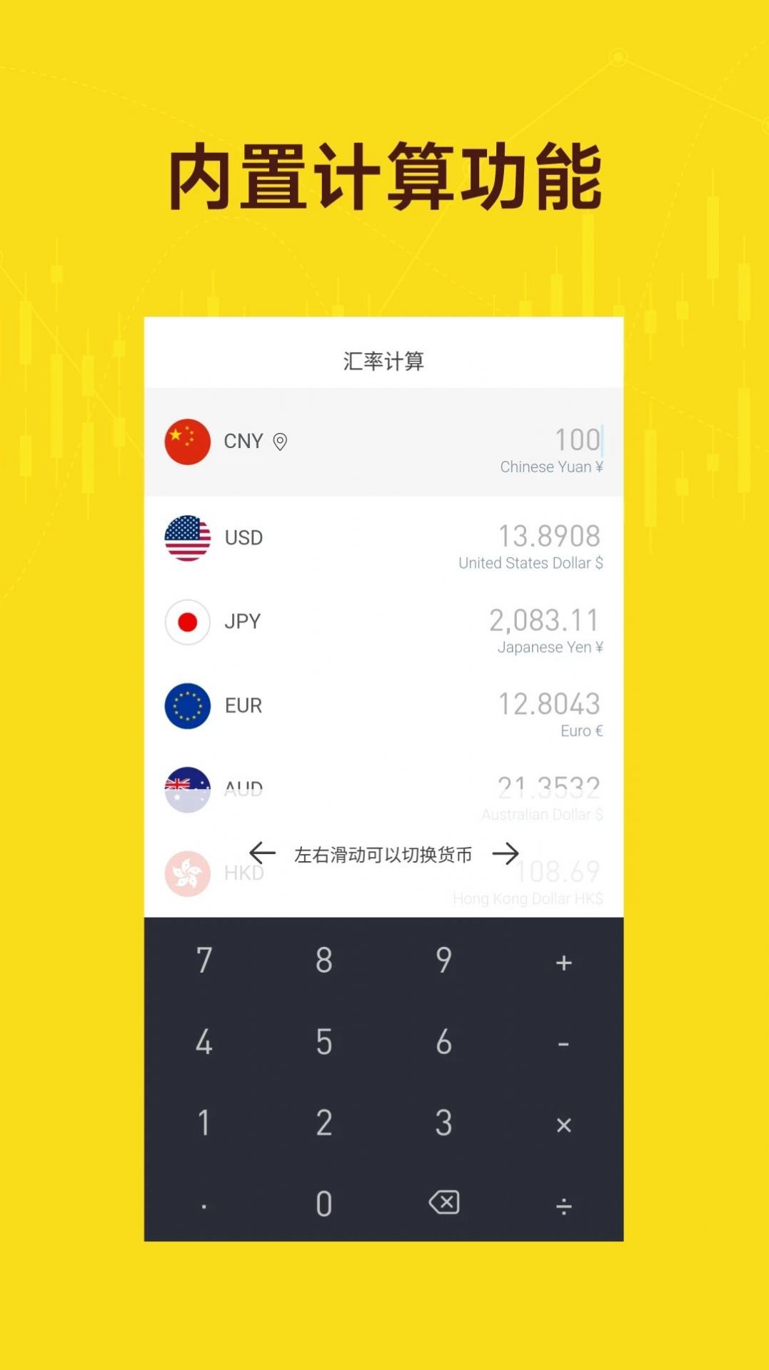 2、支持快速、准确的货币兑换计算,帮助用户进行跨国货币之间的兑换计算;