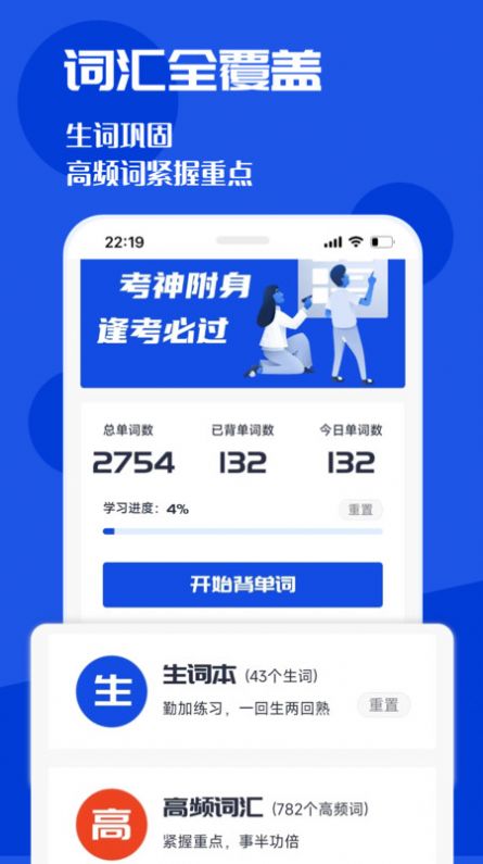 CET4背词君app具有丰富的功能和智能化设计,结合记忆测试、进度追踪和个性化定制等特点,为用户提供高效的单词学习体验。操作简单,功能全面,适用于各种单词记忆需求,是用户提升语言能力、扩展词汇量的理想选择。