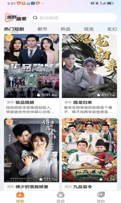 漫野趣看红包版是大家都可以随时追剧的软件,大量的一些短剧给大家提供,想要看什么短剧都是可以的,非常的方便,网上热播的短剧在这里都可以轻松的搜索到,给大家娱乐生活提供更多便利。