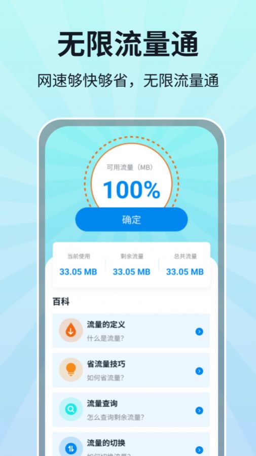 无限流量通手机版是款不错的手机流量管理工具应用软件,是能够致力于帮助用户有效管理和控制手机流量使用,让用户摆脱额外费用的困扰的软件,整个的平台是简洁易用、功能全面,是可以实时监测流量使用情况、设置流量提醒和限制,同时还支持流量统计和流量优化功能。