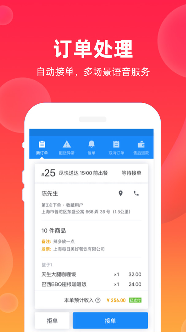 1.[订单管理]随时随地接单,处理催单,操作退单;
