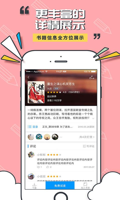 1、【海量书库】海量图书随心看,分类齐全轻松找书;换一换搜书有趣又智能;2、【贴心功能】自动阅读翻页,懒癌星人的福音;个性化阅读设置,定制专属阅读习惯;