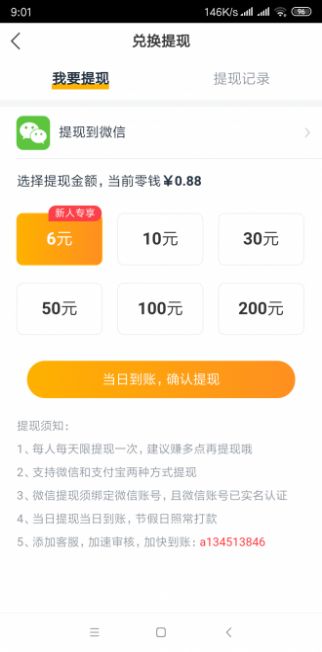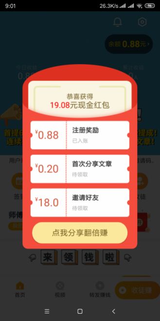 1.登录成功后点击"首页”或者"视频”页面转发任意文章或视频到微信,被点击阅读就有现金奖励;