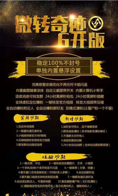 3、炫酷功能:一键点赞、评论,一键群发通讯录好友,一键转发朋友圈图片、文字、小视频,一个手机支持6个多开微信转发不闪退,聊天窗口支持语音转发(可同时多人多群),聊天窗口视频支持转发到朋友圈,一键集赞(方便、快捷),一键群发通讯录好友,自动加群好友,自动添加附近人,可漫游地图,真实删除僵尸粉(无打扰清粉),删除指定签名的所有好友(显示拉黑你的人、删除你的人)。