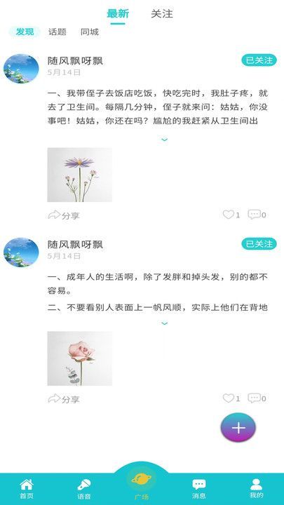 1、大家可以在广场刷各种的动态,随时轻松进行各种话题交流;