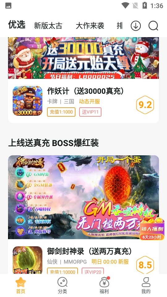 2、主界面分为推荐版块、热门版块、新游上线版块、经典游戏版块等几个区域;