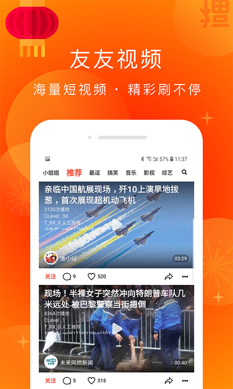二、友友视频,包含小姐姐、推荐、最逗、搞笑、音乐、影视、社会、美食、生活等视频频道。