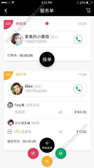 【接单】顾客下单后,员工通过美矣APP能够获取系统派发的服务单,接单后开始为顾客服务。【转单】接单服务人员忙碌时,可把服务单转给其他空闲服务人员,让人力资源合理调配。【传单】服务项目需要多人进行时,可根据流水线的方式在线传递,协作紧密分工恰当。【结单】完成服务后,结束服务单,生成无纸化账单。