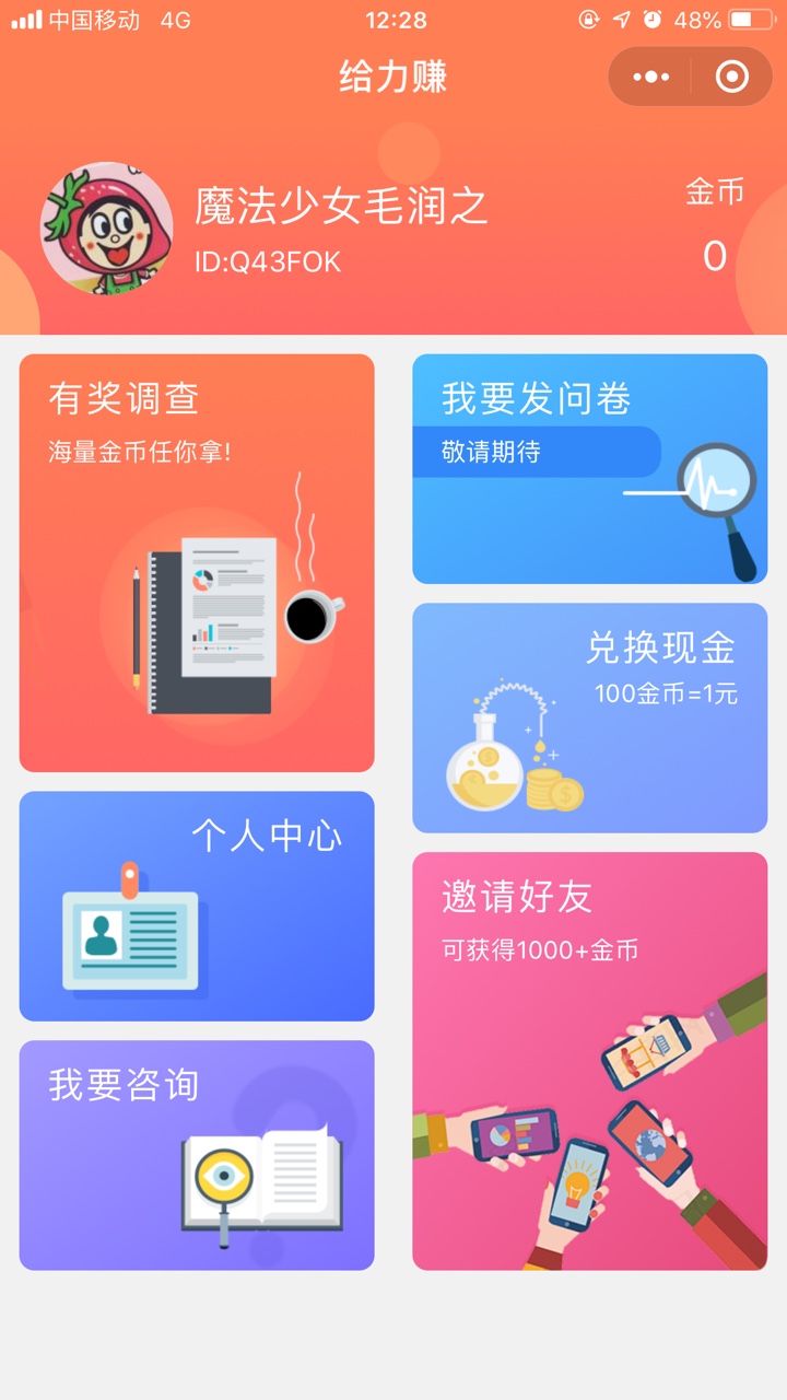 5、邀请一个新用户给50金币+20%的调查提成。