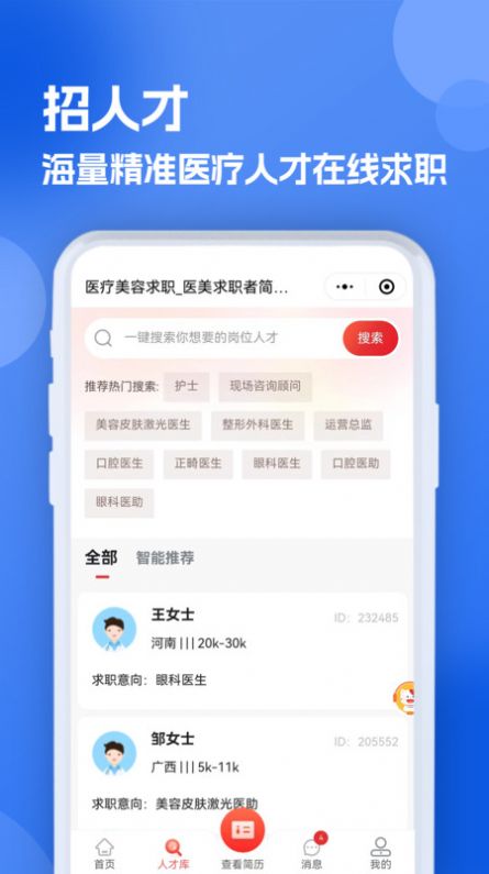 医疗人才网医护招聘app是一款为医疗人才和医院搭建沟通桥梁的高效工具,通过精准的匹配和便捷的招聘流程,为医护人员提供了更广阔的职业发展机会,同时为医院提供了优质的人才资源招聘渠道,实现医疗行业的人才对接交流。