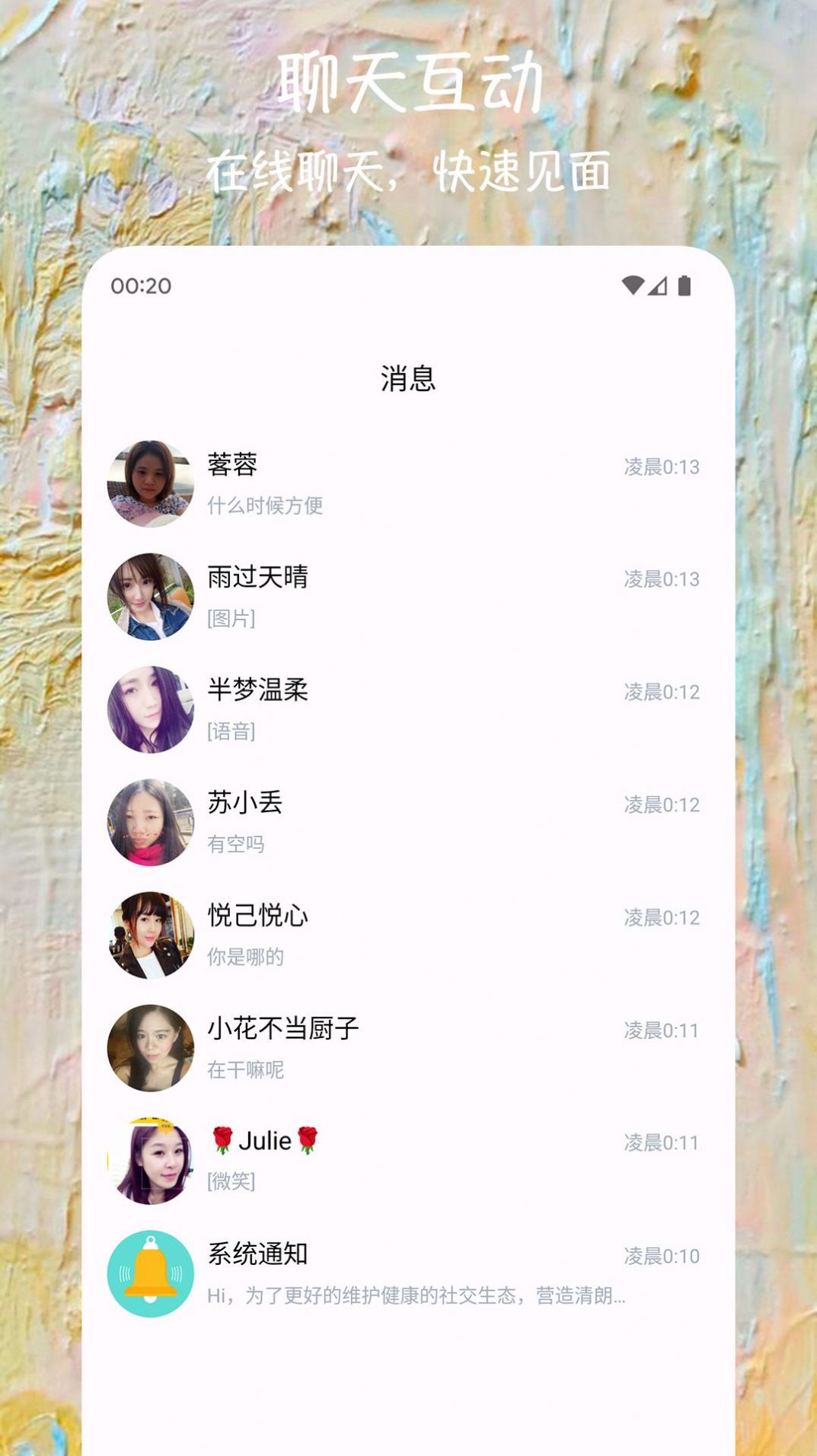 2、设置了丰富多彩的交友互动功能,比如语音聊天、兴趣圈子、约会时光等;