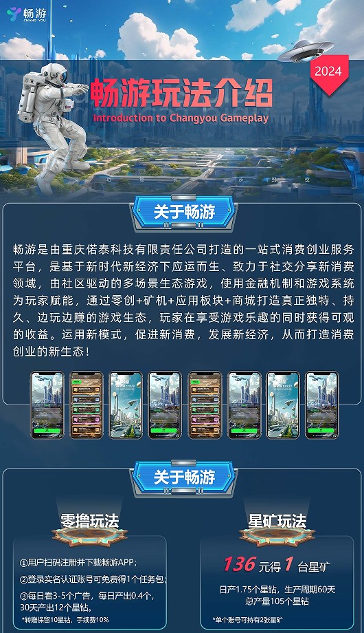 畅游app是全新上线的一站式的创业消费,潮玩电商软件,能提供多场景的生态的游戏,有独有的零撸创业+矿机投资、卷轴模式、购物消费模式,让大家可以玩游戏、看广告、推广平台挣钱,可以促进消费的发展,打造全生态的服务,整个的功能超级的强大, 可以随时便利的使用的平台。
