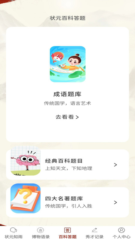 状元答多多app是不错的答题学习软件,更好的知晓百科的内容的综合软件,让你设定学习的习惯,记录各种的内容的综合软件,可以让你百科内容获取,可以累积知识面,智慧启发的综合软件,更多的学习模式可以选择,让你可以答题训练的软件,可以日积月累的全面的内容,可进行小游戏的娱乐互动的一个综合服务平台。