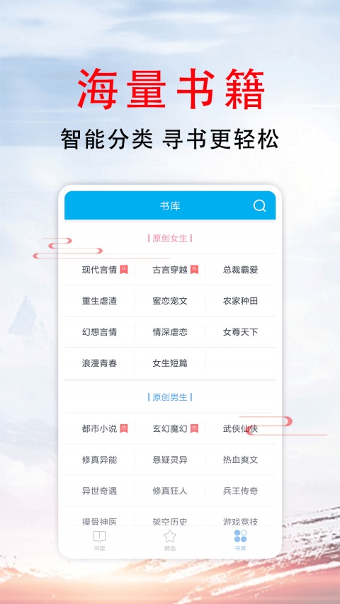 类别搜索,app为用户提供了玄幻、都市、历史以及言情等类别以供筛选。