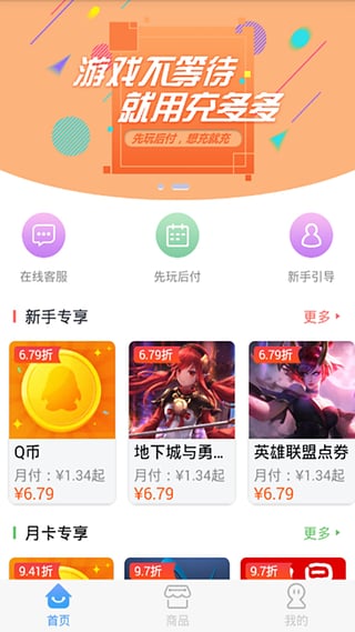 充多多app是一款属于广大游戏玩家的专属线上游戏充值平台,各种游戏的线上道具应有尽有,在线了解轻松购买,各种充值套餐任你选择,享受更多的游戏福利,玩游戏氪金也可以享优惠哦!
